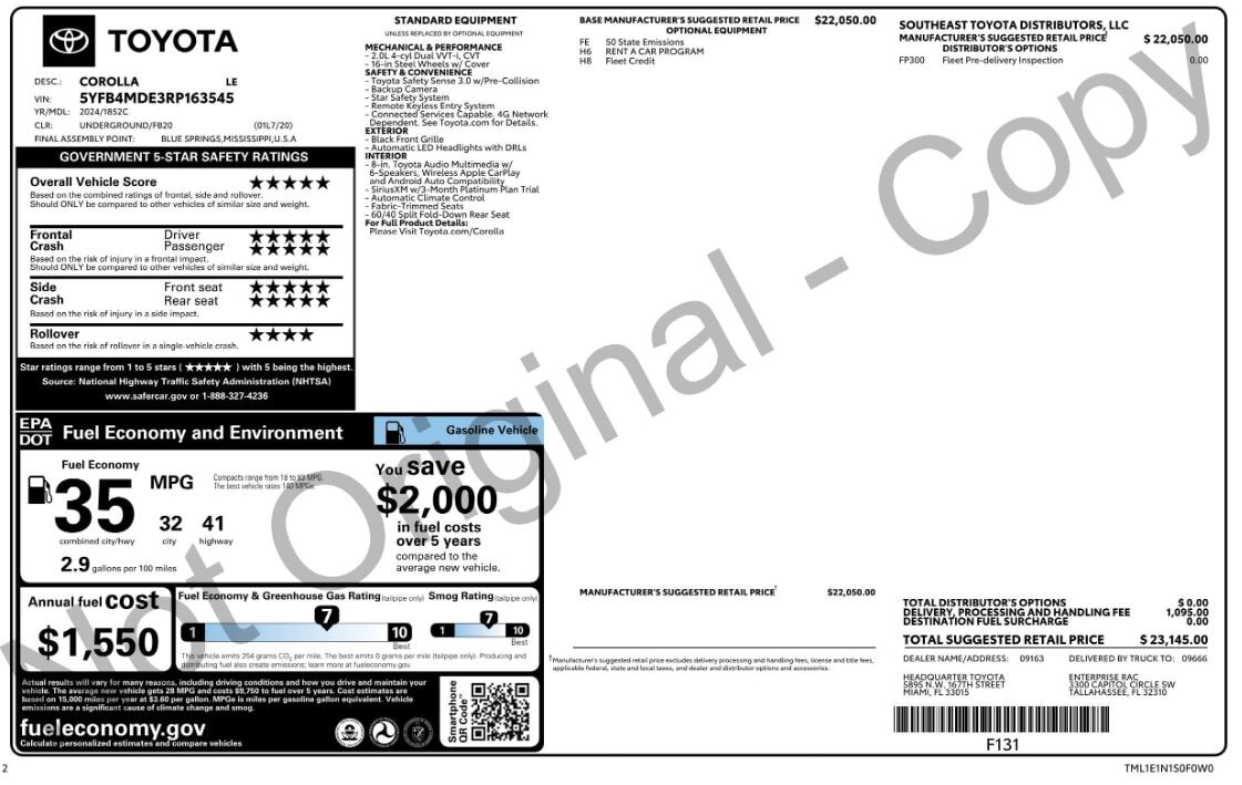 Taxes, tag, title, registration fees (government fees) and electronic filing fee of $897, predelivery service fee of $1,299 (represent costs and profit to the dealer for items such as inspecting, cleaning, adjusting vehicles and preparing documents related to the sale) are additional and not included in the vehicle price. Shipping fees must be paid in advance of vehicle delivery and are separate from the sales transaction. The listed price assumes that the final purchase will be completed in the State of Florida, unless the vehicle is non-transferable. All vehicles are subject to prior sale.